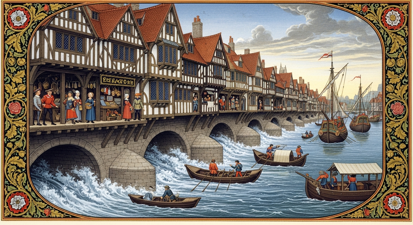 Between 1485 and 1603, during the Tudor dynasty’s reign, this remarkable structure served as the beating heart of London’s commercial life. Its 19 massive stone arches didn’t just support a community above the water; they created such violent currents below that navigating beneath the bridge became a life-or-death gamble known as ‘shooting the bridge’. For Tudor Londoners, the bridge represented both the pinnacle of medieval engineering and a daily reminder of the thin line between prosperity and peril that defined their age.